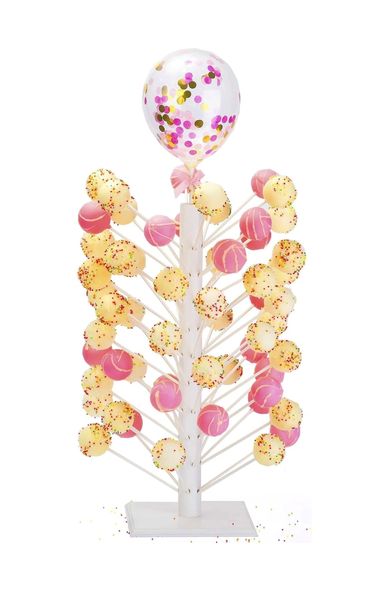 This elegant & functional stand holds 60 cake pops. It is perfect for birthday parties, holidays, showers, or celebrations of any type! It is definitely a show piece and looks great on your table. It can hold lollipops and candies too. The balloon at the top is replaceable, so you can customize it with your own theme.