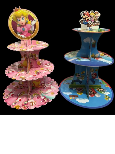 These fun Princess Peach & Mario themed Super Mario Bros. treat stands level up any birthdays or slumber party. Kids and adults alike will love seeing an array of treats perched on the beloved video game themed towers. These delightful stands hold 14 standard size cupcakes each. $10 to rent both for the day or $5 each.