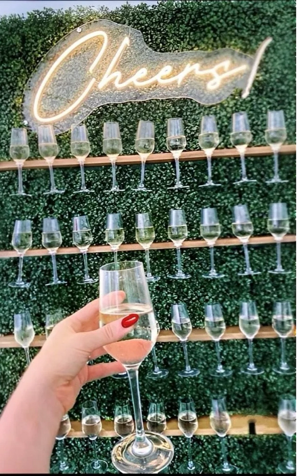 Imagine a piece that captivates your guests and elevates the ambiance of your event with sparking champagne, your favorite wine or a festive drink. This Champagne Wall is just the answer. It is pure white & completely customizable. Add vinyl lettering, our rented Neon Signs or LED lighting for a more dramatic effect. It holds 80 glasses and is a guaranteed show stopper for your next event.